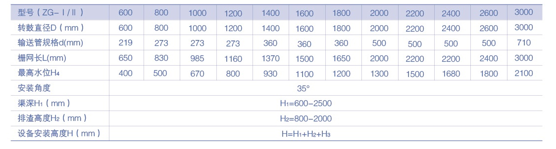 設(shè)備與水平面成35度安裝在水渠中,污水從格柵開式端口流經(jīng)柵條進(jìn)入渠道中,柵條將固體污物截留,到一定的水位差時(shí),定位在中心軸上的旋轉(zhuǎn)耙在柵鼓內(nèi)旋轉(zhuǎn),旋轉(zhuǎn)耙耙齒插入格柵條內(nèi)將格柵條清潔,并帶動(dòng)向上運(yùn)轉(zhuǎn),當(dāng)運(yùn)行至高點(diǎn)時(shí),所有柵渣落入中央柵渣螺旋槽內(nèi),并通過中央柵渣螺旋槽內(nèi)螺旋輸送壓榨機(jī)擠干、脫水,并運(yùn)至上端排料斗排出。