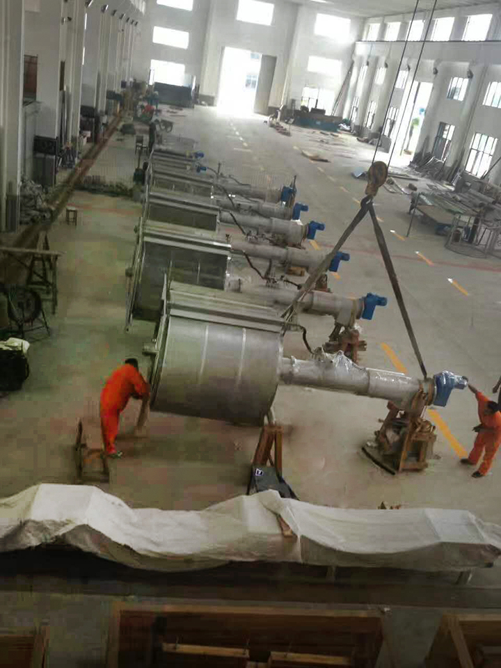 該設(shè)備與水平面成35度安裝在水渠中,污水從轉(zhuǎn)鼓的端頭流入鼓中,水通過轉(zhuǎn)鼓側(cè)面的柵縫流出,格柵將水中的懸浮物、漂浮物等留在轉(zhuǎn)鼓中,轉(zhuǎn)敏以一定的速度旋轉(zhuǎn),鼓的上方有尼龍刷和沖洗水噴嘴,將柵渣清除井通過螺旋輸送運(yùn)轉(zhuǎn)擠干,脫水,運(yùn)至上端排料斗,經(jīng)輸送機(jī)運(yùn)走。